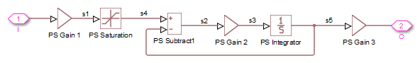 The gain of the PS Gain 1 block establishes the steady-state relationship between the input and output signals. The PS Saturation block keeps the output signal within the +/– valve stroke range. The gain of the PS Gain 2 block is 1/Time constant, which makes it possible to reproduce the first-order lag by combining this block with the PS Subtract and PS Integrator blocks.