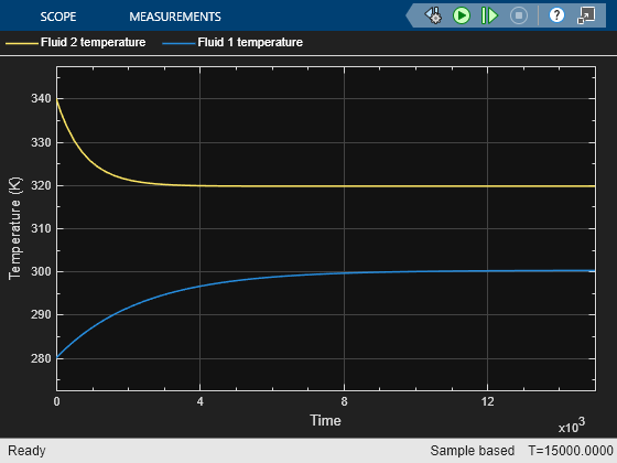 The model results match the analytical results. Both fluids change by about 20 K, although it takes slightly longer for the colder fluid to reach steady state.