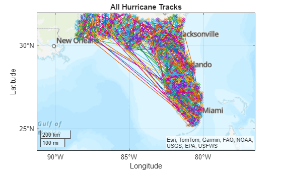 % Iterate through unique Year values years = unique(floridalandhcanes.Year); for year = years' yearhcanes = floridalandhcanes(floridalandhcanes.Year == year,:); % Iterate through unique TCnumber values TCnums = unique(yearhcanes.TCnumber); for TCnum = TCnums' hcane = yearhcanes(yearhcanes.TCnumber == TCnum,:); % Plot hurricane track using a line geoplot(hcane.Shape.Latitude,hcane.Shape.Longitude,"-*") end end
