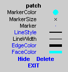 Property values that appear on the right side of the editor box are modified by clicking and dragging. For example, to change the MarkerColor property of a line object, click and hold the dot next to MarkerColor, and drag the cursor until the dot appears in the desired color.