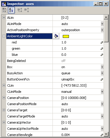 Property Inspector view of axes object