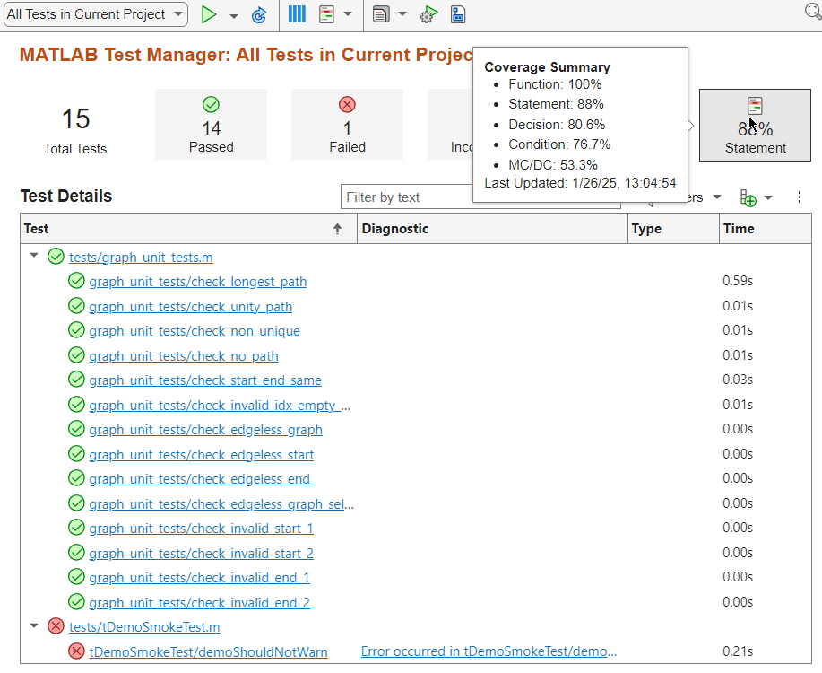 In the Test Manager, the top row gives a summary of the state of the project testing. Fourteen tests pass, one failed, and 88% of code statements executed. To see more details, point your cursor to the Statement button in the Test Manager summary.