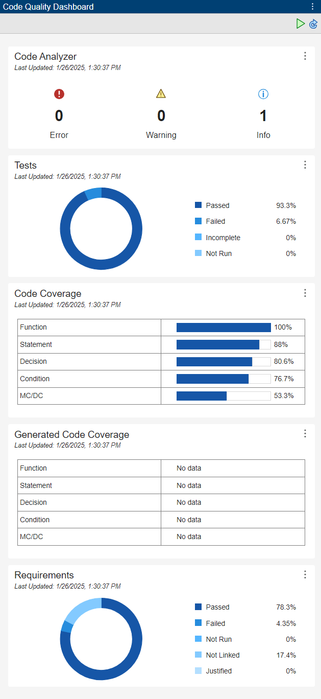 In the Code Quality Dashboard, in the yellow banner, click Refresh Metrics. Then, on the Code Coverage card, click the three dot menu three-dot-icon.png and select Open Report. Coverage reports created from the Code Quality Dashboard open with the most recent results, apply any coverage justifications that you have already created, and are writable, so you can add or remove coverage justifications.