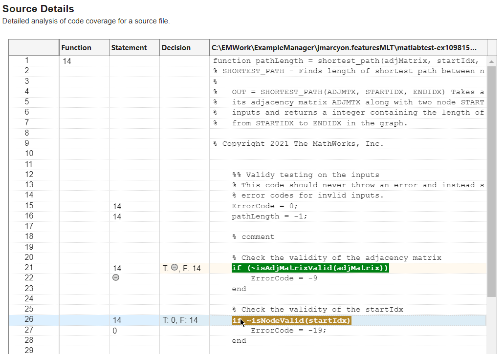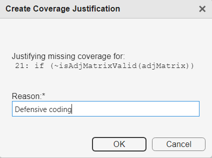 In the Source Details section, create a justification for line 21 by clicking the entry point for the code block if (~isAdjMatrixValid(adjMatrix)). In the Create Coverage Justification dialog box, enter a reason for the justification. For this example, enter Defensive coding and click OK.