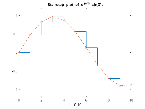 Figure contains an axes object. The axes object with title Stairstep plot of e toThePowerOf -( alpha *t) baseline blank sin beta *t, xlabel t = 0:10 contains 2 objects of type stair, line.
