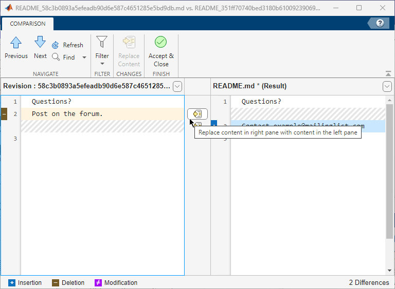 1. In the Comparison report, select a difference in the report and click Replace Content. The selected difference is copied from the file on the left to the file on the right. To undo the content replacement, click Undo. Alternatively, use the inline Replace Content and Undo icons. The merged file name at the top of the report displays the dirty flag (filename.m*) to show that the file contains unsaved changes.