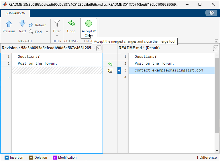 Tip: To keep your version of the file instead, do not make changes to the (Result) file before you click Accept & Close.