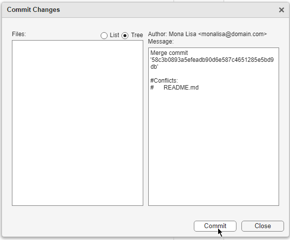 An autogenerated merge commit message shows in the Commit dialog box. To finalize the merge, click Commit.