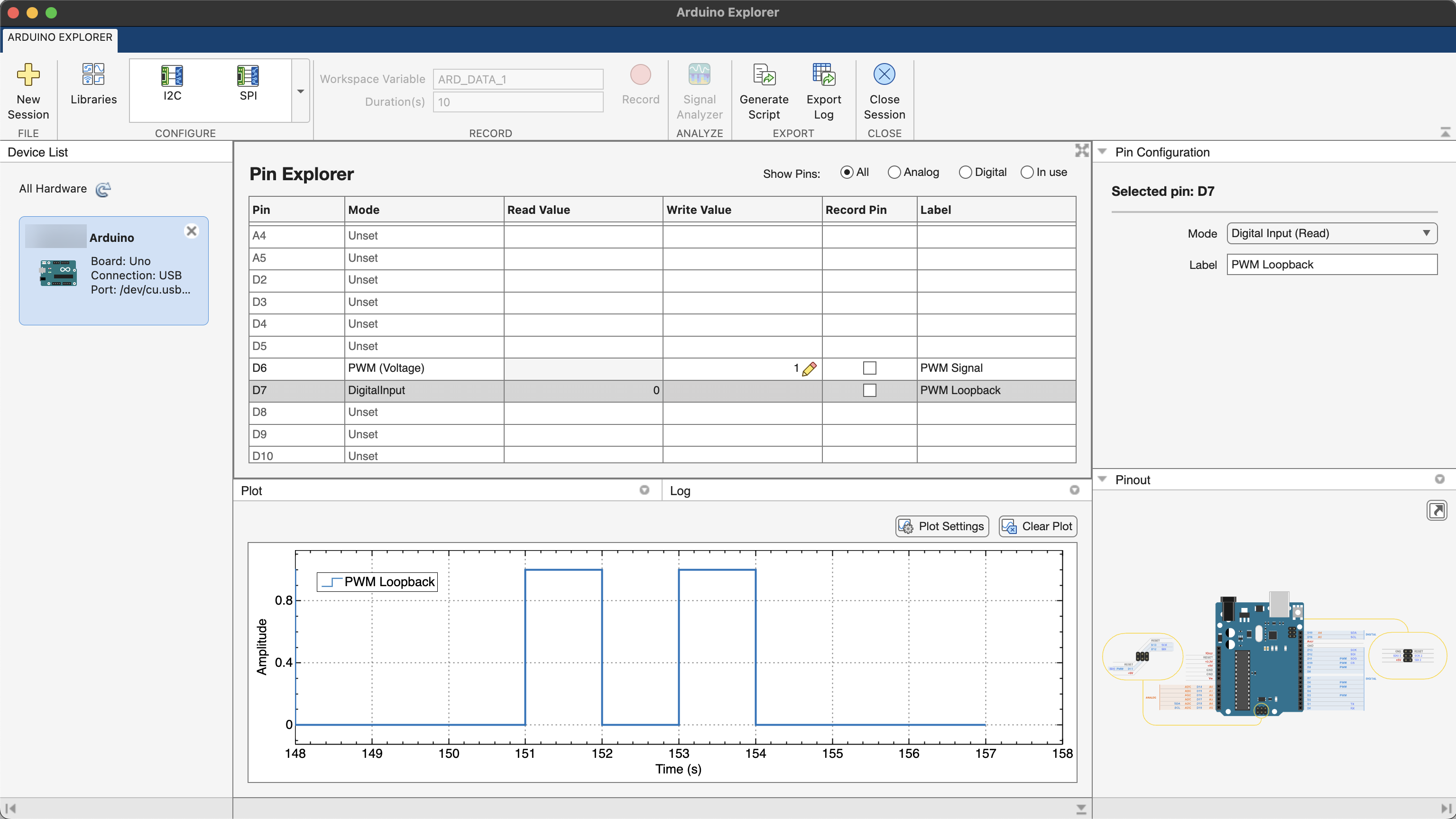 Use the Arduino® Explorer to interactively set up an Arduino board, read, write, and analyze data from the board, and generate code.