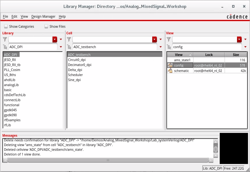 Each of the generated blocks has a systemVerilog view and a symbol view. The testbench cellview is a schematic, requiring a config view for model elaboration.