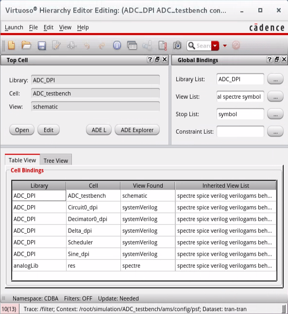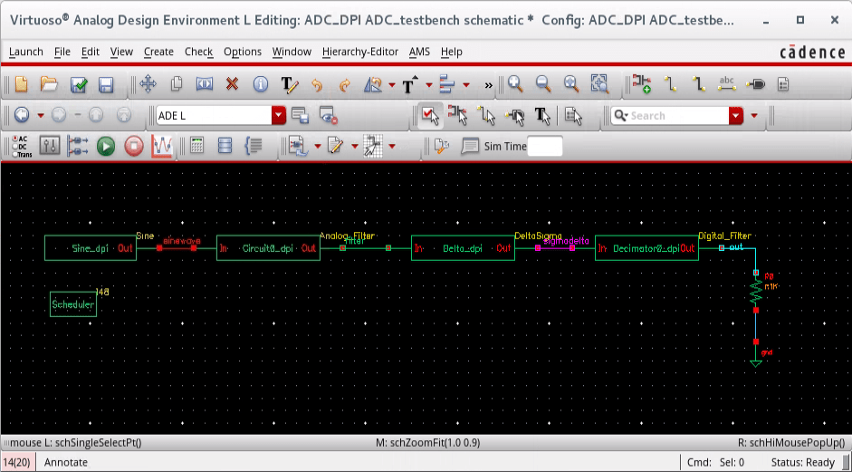 The first time you open a systemVerilog module in AMS Designer, a symbol is automatically created for block instantiation. The cellviews need to be instantiated in the testbench schematic one at a time and connected in the same sequence. The name of each block instance is important, as this will be referenced by the scheduler.