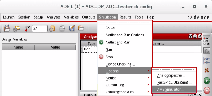 To start the simulation, you must launch ADE-L, choose ams as the simulator and select a transient analysis. Before launching the simulation, you must also link and load the shared objects created for each block.