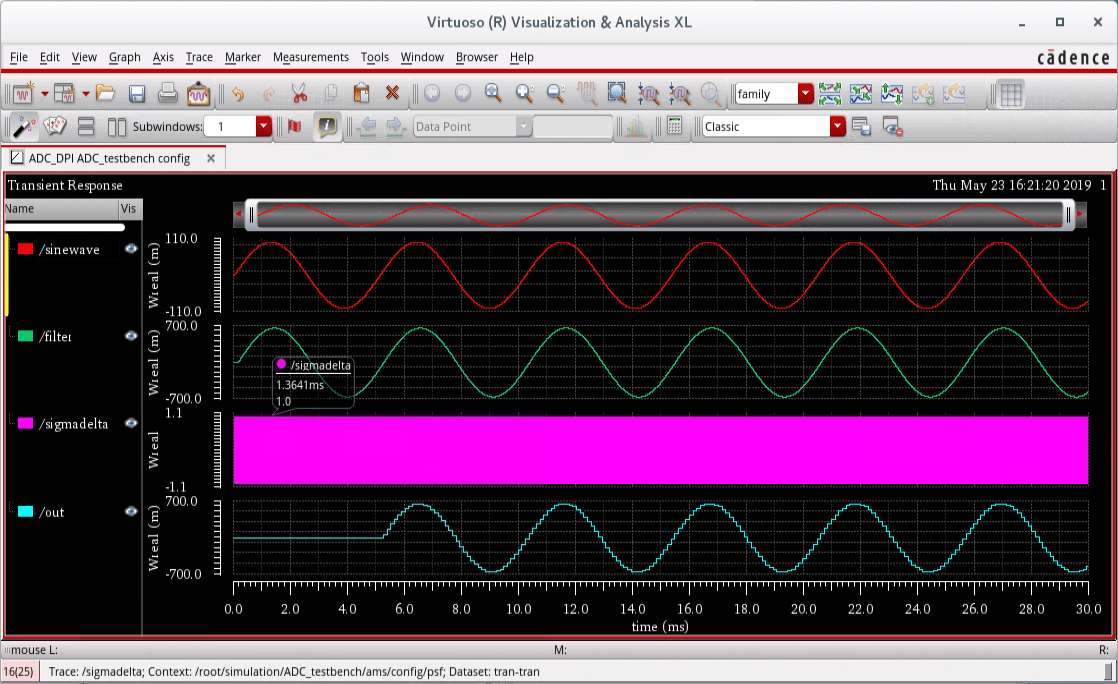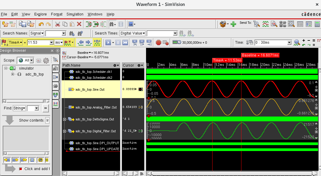 Either of the above two commands will launch the simulation using Xcelium digital solver. The ADC waveforms will be visible on SimVision after the completion of simulation.