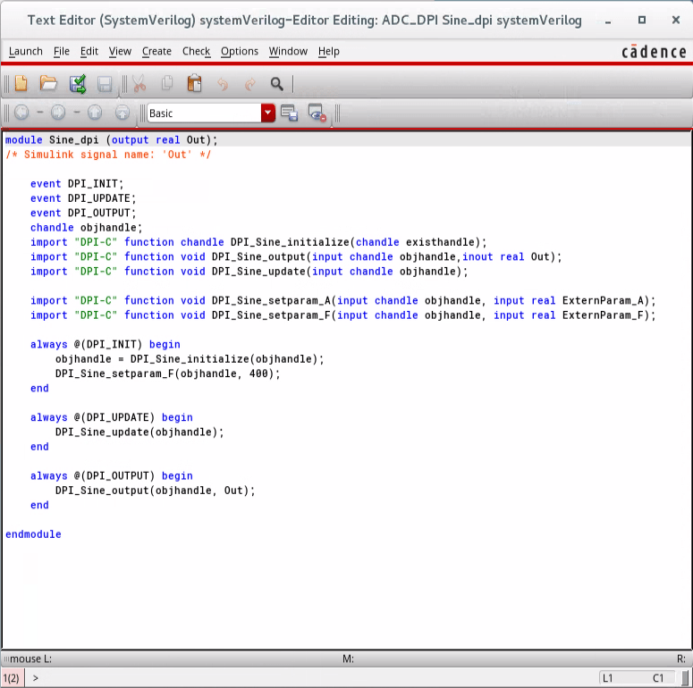 cfg = getActiveConfigSet(model); %Pick Target file for DPI-C gen switchTarget(cfg,'systemverilog_dpi_grt.tlc',[]); cfg.set_param('DPICustomizeSystemVerilogCode', 'on'); % Customize generated SystemVerilog code cfg.set_param('GenerateReport', 'off'); % Dont Create code generation report