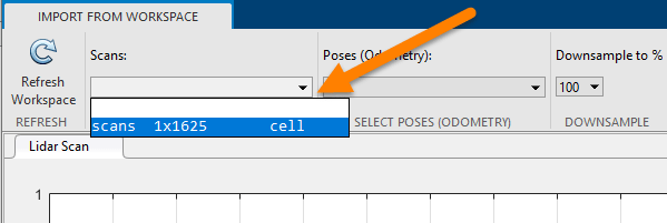 | Per caricare i file di registro di rosbag, selezionare Import > Import from rosbag . Selezionare il file rosbag e fare clic su Open . Si apre la scheda Import. Per ulteriori informazioni, vedere Importare e filtrare un rosbag. Per caricare i dati dall'area di lavoro, Import > Import from workspace . Seleziona le variabili Scans e Poses utilizzando i menu a discesa forniti. È anche possibile specificare le variabili nella funzione |