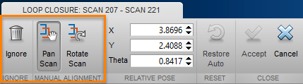 | Fare clic su Incremental Match per modificare la posa relativa del fotogramma attualmente selezionato e allineare la scansione con quella precedente. Fare clic su Loop Closure per modificare o ignorare la chiusura del loop rilevata per il frame corrente. Utilizzare il cursore in basso per tornare alle aree in cui la corrispondenza delle scansioni o le chiusure dei loop non sono accurate. È possibile modificare un numero qualsiasi di scansioni o chiusure di loop. Per ulteriori informazioni, vedere Modifica delle scansioni incrementali e delle chiusure di loop. |