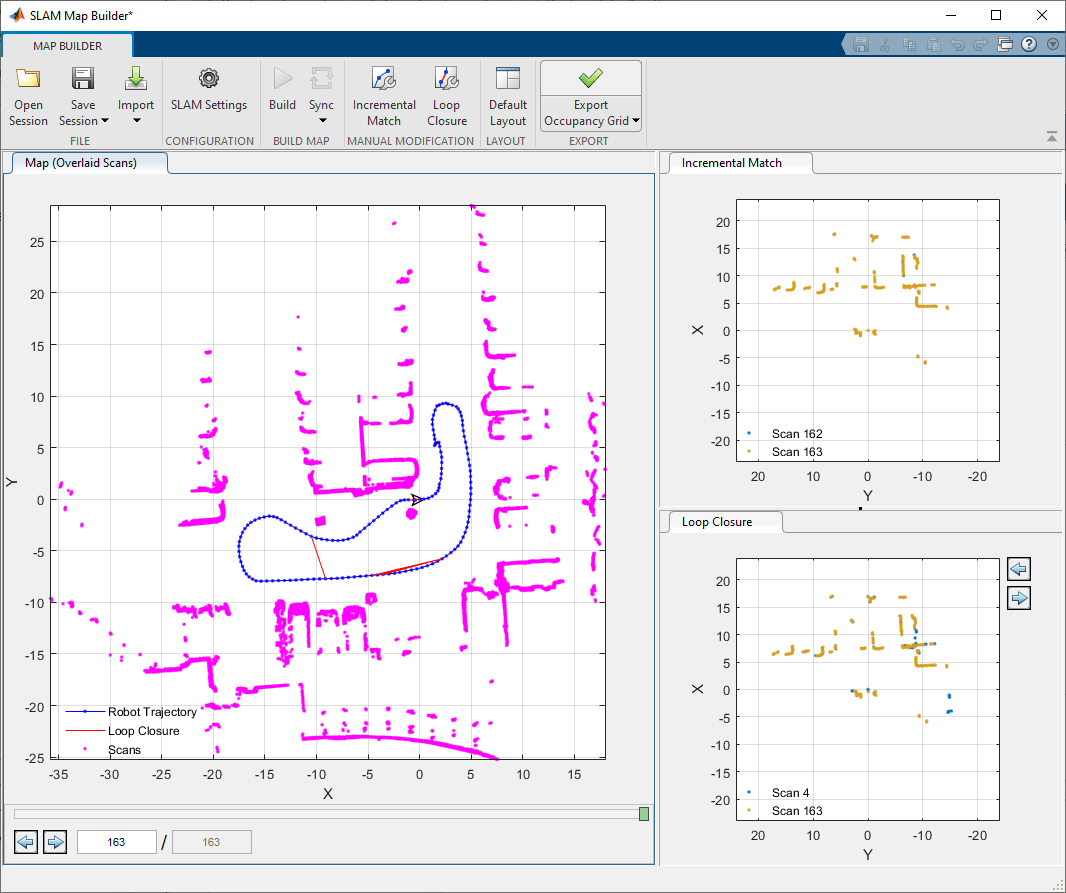 L'app SLAM Map Builder carica le scansioni LiDAR registrate e i dati dei sensori di odometria per creare una griglia di occupazione 2D utilizzando algoritmi di localizzazione e mappatura simultanea (SLAM). La scansione incrementale allinea e sovrappone le scansioni per creare la mappa. Il rilevamento della chiusura del circuito compensa la deriva dell'odometria del veicolo rilevando le posizioni visitate in precedenza e regolando la mappa complessiva. Talvolta l'algoritmo di corrispondenza della scansione e il rilevamento della chiusura del loop richiedono una regolazione manuale. Utilizzare l'app per allineare manualmente le scansioni e modificare le chiusure dei loop per migliorare la precisione complessiva della mappa. È anche possibile regolare le impostazioni dell'algoritmo SLAM per migliorare la creazione automatica delle mappe.