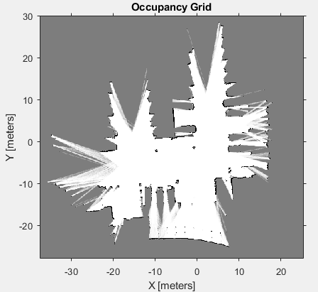 | Quando sei soddisfatto dell'aspetto della mappa, clicca su Export to OccupancyGrid per esportarla in un file m o salvarla nell'area di lavoro. La mappa viene visualizzata come una griglia di occupazione probabilistica 2D in un oggetto occupancyMap . |