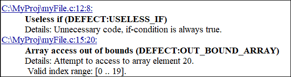 The console format is only available for Polyspace as You Code. In practice, you might want to specify additional analysis options using an options file. If the options file is called polyspace_options.txt, the command to run Polyspace as You Code in the preceding script can be replaced with: