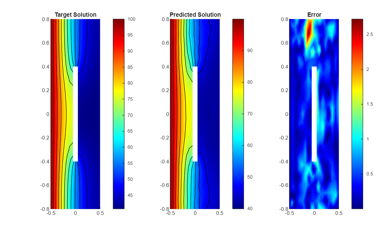 figure tiledlayout(1,3) nexttile pdeplot(thermalmodel.Mesh, ... XYData=TTest(1,:,1), ... Contour="on", ... ColorMap="jet"); title("Target Solution") nexttile pdeplot(thermalmodel.Mesh, ... XYData=UTest(1,:,1), ... Contour="on", ... ColorMap="jet"); title("Predicted Solution") nexttile pdeplot(thermalmodel.Mesh, ... XYData=(abs(UTest(1,:,1)-TTest(1,:,1))), ... Contour="off", ... ColorMap="jet"); title("Error")