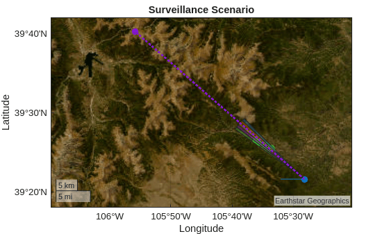 rdrLLA = [39.36 -105.47 7e3]; % [deg deg m] rdrHeading = 270; % deg, West rdrSpeed = 180; % Speed in knots rdrDur = 60; % Duration in seconds [wpts,toa] = helperConstantVelocityGeoWaypoints(rdrLLA,rdrHeading,rdrSpeed,rdrDur);