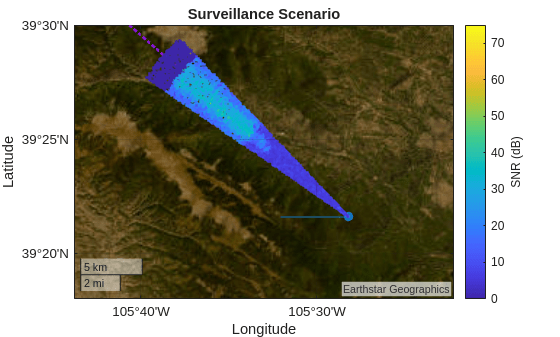 pos = zeros(3,numDets); [pos(1,:),pos(2,:),pos(3,:)] = sph2cart(deg2rad(estAzs),deg2rad(estEls),estRgs); pos = rdrMntAxes*pos + rdrMntLoc(:); pos = rdrPlatAxes*pos + rdrPose.Position(:); [detLats,detLons] = ecef2geodetic(wgs84Ellipsoid,pos(1,:),pos(2,:),pos(3,:)); figure(figScene) hRgAz.Visible = "off"; geoscatter(detLats,detLons,70,estSINRdB,"filled",Marker="diamond",MarkerEdgeColor="black",DisplayName="Detections"); legend(findobj(gca().Children,"-not",DisplayName="")) geolimits([39.35 39.45],[-105.6 -105.5]) clim([0 20])