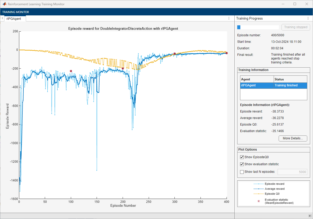trainOpts = rlTrainingOptions(... MaxEpisodes=5000, ... MaxStepsPerEpisode=200, ... StopTrainingCriteria="EvaluationStatistic",... StopTrainingValue=-40);