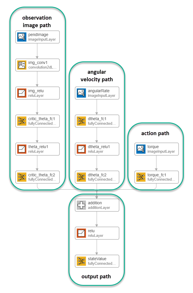 additionLayer— Connect the output of all input paths to the input of this layer.reLULayerfullyConnectedLayer— Set OutputSize to1for the scalar value function.