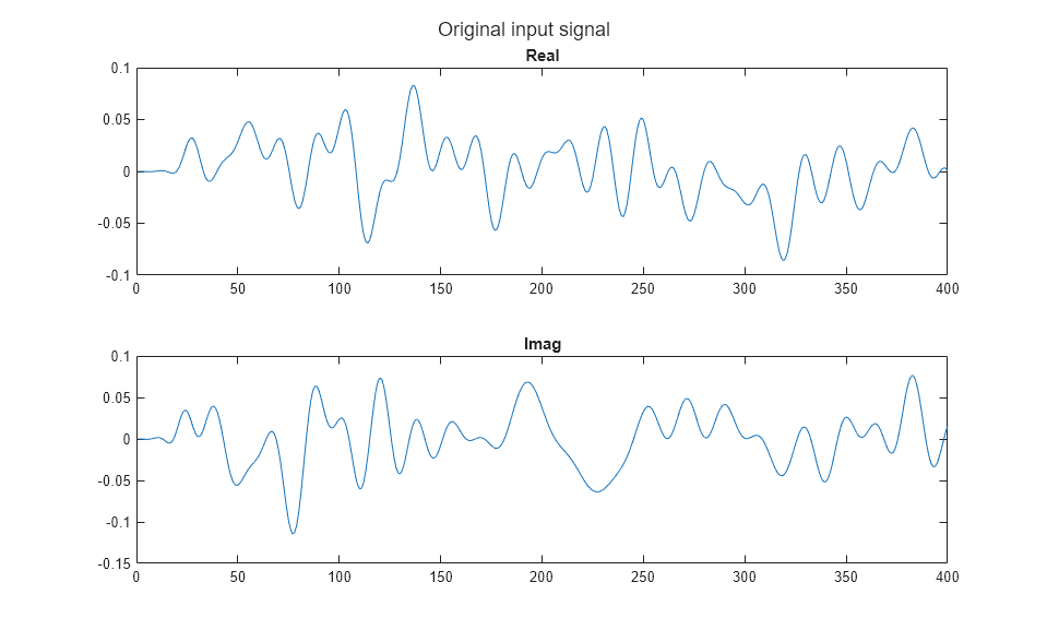 f1 = figure; subplot(2,1,1),plot(real(input)),title('Real') subplot(2,1,2),plot(imag(input)),title('Imag') sgtitle('Original input signal')