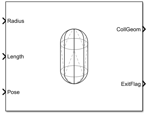 The Collision Capsule block outputs a capsule primitive collision geometry defined by a radius and length, with the central line segment of the capsule aligning with its z-axis. The origin of the body-fixed frame is located at the midpoint of the central line segment.