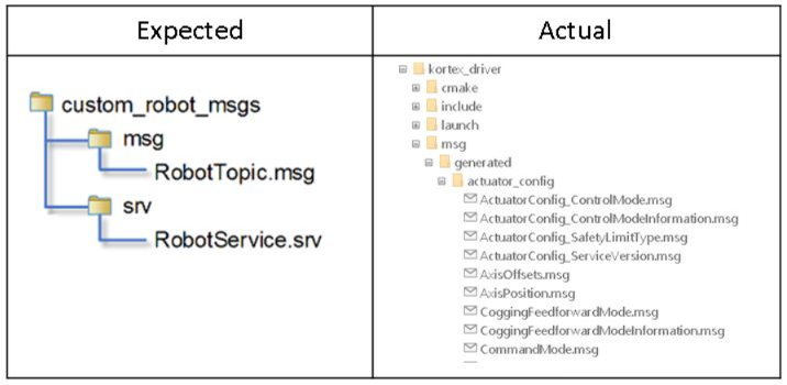 As mentioned in the ROS Custom Message Support, rosgenmsg expects custom message files (.msg files) present under the folder msg and custom service files (.srv files) under the folder srv. However the default folder structure of the ROS package kortex_driver contains several sub folders inside the msg and srv folder. Hence before proceeding further, manually remove all the subfolders inside the msg and srv folder.