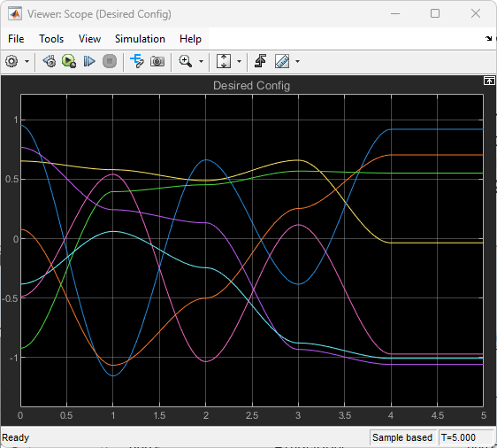 The scopes show the tracking results of the Joint Space Motion Model block. As can be seen on the left in the figures below, the initial configuration of the robot differs from the reference trajectories, but the controlled motion ensures that the trajectory is reached and tracked for the duration of the simulation. The final scope displays the X, Y, and Z position of the end effector in the world frame.