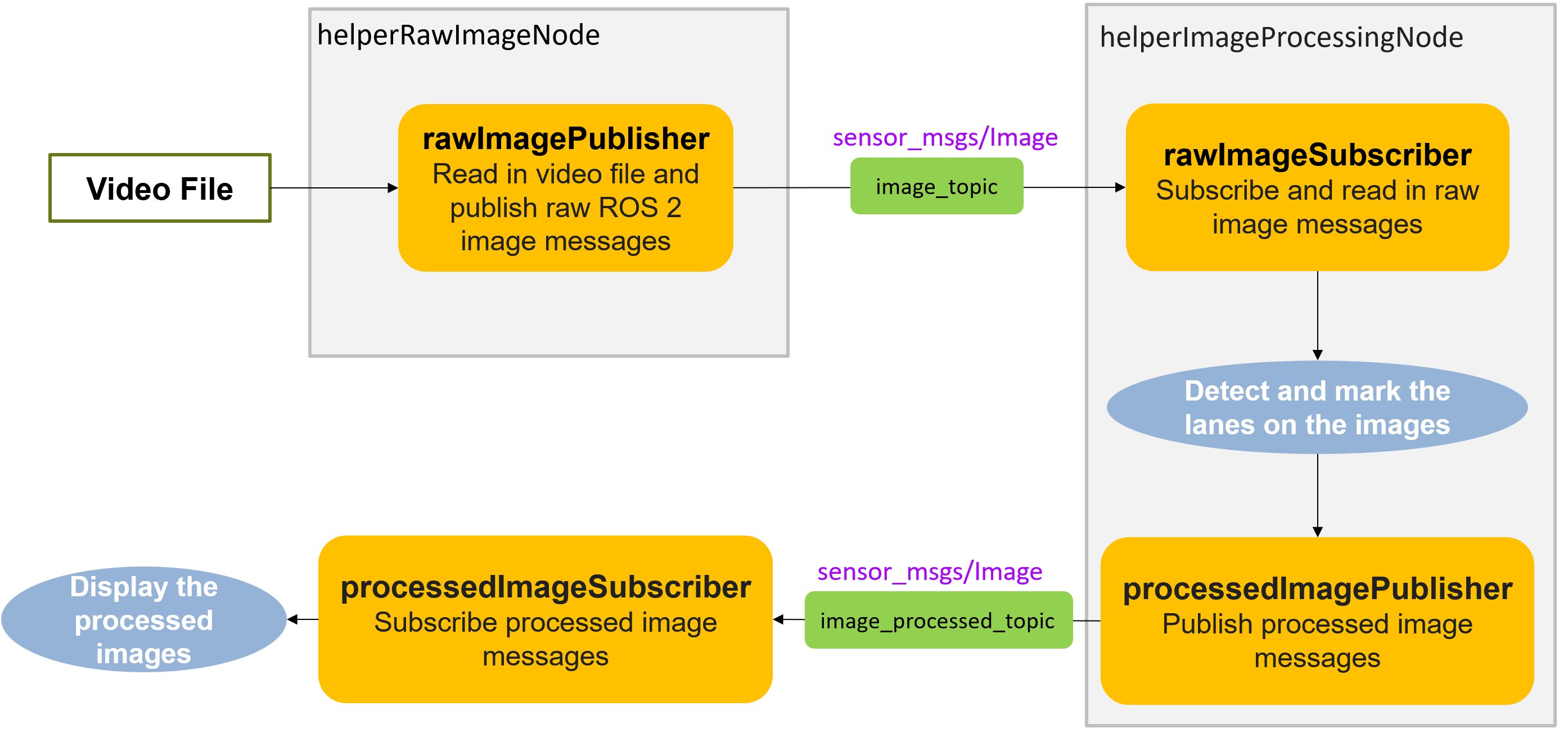 The helperImageProcessingNode function reads the raw images from the ROS 2 network, detects and marks the lanes on the raw images, and publishes the processed images.