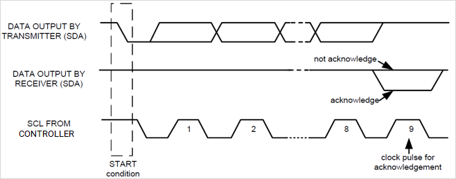 I2C communication defines the data bytes to be 8-bit long. I2C can transmit data of single byte or multiple bytes. During the data transmission, an acknowledge ACK signal follows every byte. A clock for ACK is generated by the controller, while the receiver (controller or peripheral) generates the ACK by pulling down the SDA and holding it to LOW during the high portion of the acknowledge clock pulse.