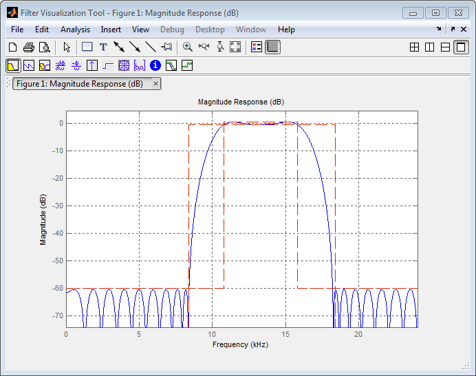 Se si è installato DSP System Toolbox, lo strumento Filter Visualization produce la seguente figura con le linee rosse tratteggiate che indicano le bande di transizione e l’unity gain (0 in dB) sulla banda passante.>> fvtool(BandPassFilt) %plot the filter magnitude response