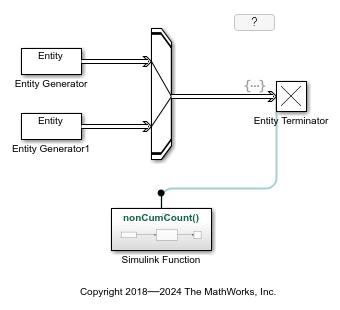 Open the example model noncumulative_count. The model contains two Entity Generator blocks, an Entity Input Switch block, an Entity Terminator block, and a Simulink Function block from the SimEvents® library. For more information about Simulink Function blocks, see Simulink Function.