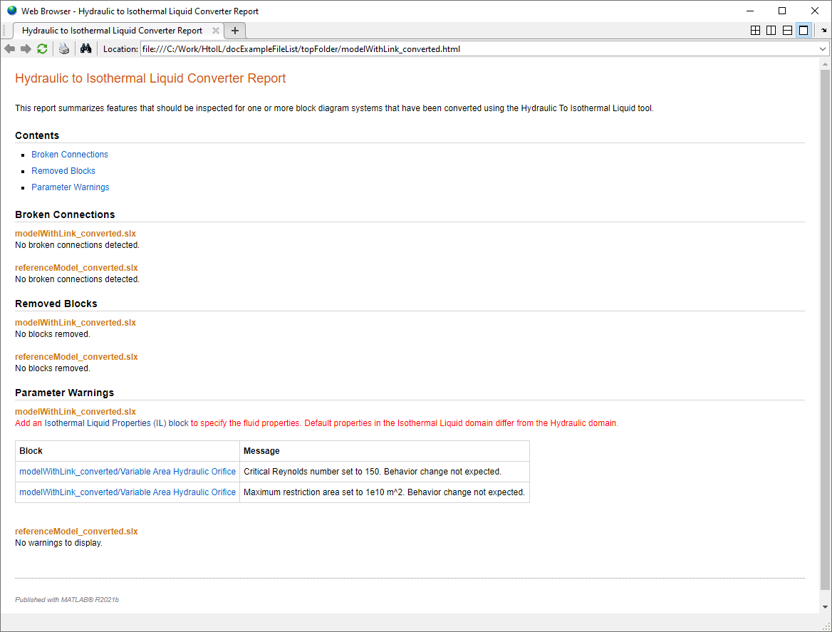 Se un file elencato in oldfiles contiene blocchi della Libreria di base > Idraulica o della Libreria Fluidi > Idraulica (isotermica), lo strumento li sostituisce con blocchi equivalenti della Libreria dei liquidi isotermici, aggiunge _converted al nome del file originale e salva ogni file convertito nella stessa cartella del file originale. Se un file non contiene blocchi idraulici e non fa riferimento a un file elencato in oldfiles che contiene blocchi idraulici, lo strumento lascia il file invariato. Lo strumento restituisce l'elenco dei nomi dei file convertiti newfiles e salva il rapporto di conversione nella posizione del primo file elencato in oldfiles. Il rapporto di conversione, denominato HtoIL_report, elenca tutti i problemi riscontrati durante la conversione di tutti i file dell'elenco oldfiles.