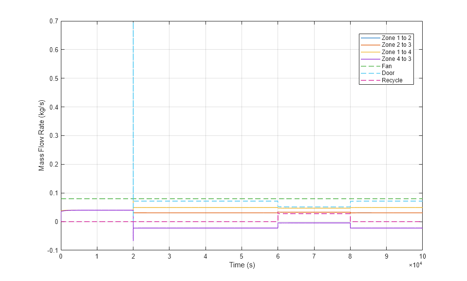 Questo esempio modella un circuito di ventilazione in un edificio. Il volume d'aria all'interno dell'edificio è suddiviso in quattro zone. L'unità di ventilazione soffia aria fredda nella Zona 1 ed estrae aria dalla Zona 3. L'aria estratta può essere opzionalmente riciclata e reintrodotta nella Zona 1. Una porta può essere aperta nella Zona 4 per espellere l'aria nell'atmosfera.