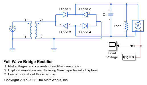 Questo esempio mostra un trasformatore CA ideale e un raddrizzatore a ponte full-wave che converte 120 volt CA in 12 volt CC. Il trasformatore ha un rapporto di spire di 14 e riduce l'alimentazione a 8,6 volt rms, ovvero 8,6*radice quadrata di (2) = 12 volt picco-picco. Il rettificatore a ponte full-wave combinato con un condensatore converte quindi il segnale in CC. La resistenza rappresenta un carico tipico.