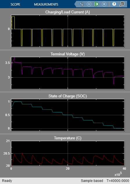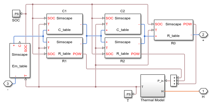 Per modellare la temperatura della batteria si utilizza un semplice modello termico. Si presume che il raffreddamento avvenga principalmente per convezione e che il riscaldamento sia dovuto principalmente alla resistenza interna. Un pacco batterie può essere modellato collegando in serie più copie del blocco di celle della batteria.