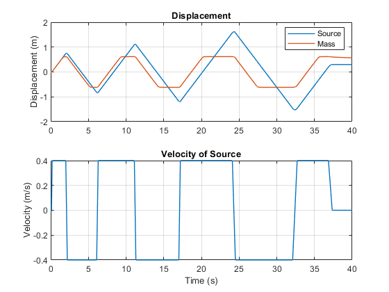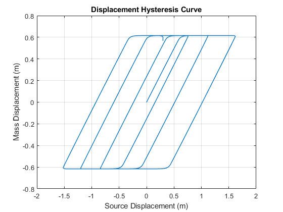Questo esempio mostra una massa collegata a una molla e a uno smorzatore viscoso. La massa è azionata da una sorgente di velocità ideale attraverso un elemento di attrito. Il profilo di movimento della sorgente è selezionato in modo tale che, tracciando lo spostamento della massa rispetto allo spostamento fornito dalla sorgente, si ottenga una curva tipica di isteresi.