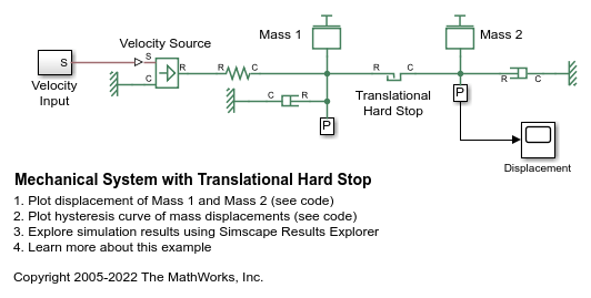Questo esempio mostra due masse collegate da un arresto rigido. La massa 1 è azionata da una sorgente di velocità ideale. Quando l'input di velocità cambia direzione, la massa 2 rimane ferma finché la massa 1 non raggiunge l'altra estremità del gioco modellato dall'arresto rigido traslazionale. Tracciando lo spostamento della massa 2 rispetto allo spostamento della massa 1 si ottiene una curva tipica di isteresi.