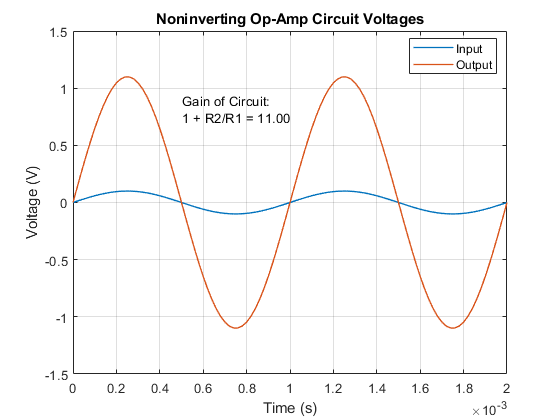 Questo modello mostra un circuito op-amp non invertente. Il guadagno è dato da 1+R2/R1 e, con i valori impostati a R1=1K Ohm e R2=10K Ohm, la tensione di ingresso da 0,1V picco-picco viene amplificata a 1,1V picco-picco. Poiché il blocco Op-Amp implementa un dispositivo ideale (ossia a guadagno infinito), questo guadagno si ottiene indipendentemente dal carico di output.