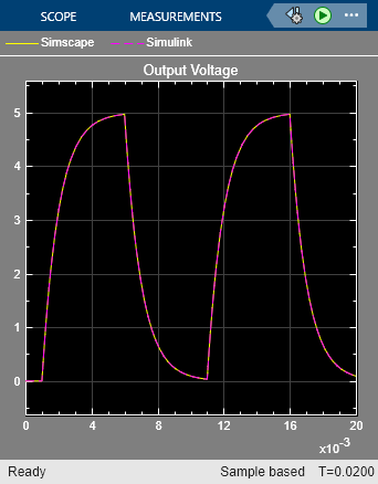 Il circuito è alimentato da un'onda quadrata di tensione. I valori di resistenza e capacità sono definiti utilizzando le variabili di MATLAB®.