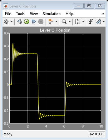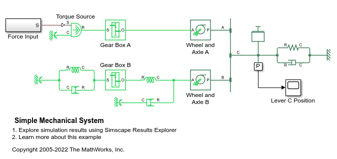 Questo esempio mostra un modello di sistema che collega il movimento rotazionale e traslazionale. Una leva sommatoria aziona un carico costituito da una massa, un attrito viscoso e una molla collegata al suo giunto C. Il giunto B è sospeso su due molle rotazionali collegate al punto di riferimento tramite una ruota, un asse e un riduttore. Il giunto A è collegato a una sorgente coppia attraverso un riduttore e un meccanismo ruota e asse.