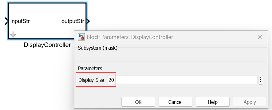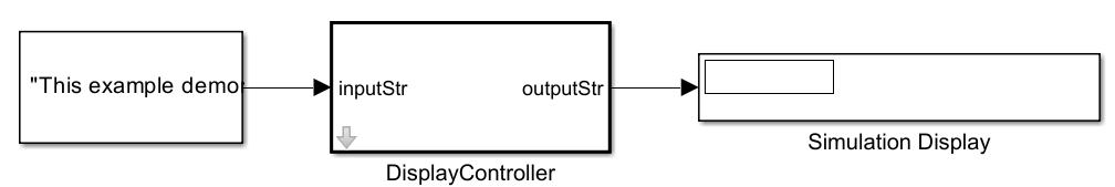 Open the model. In this model, DisplayController subsystem receives a custom string and outputs a fixed-size Simulink® string with a scrolling effect.