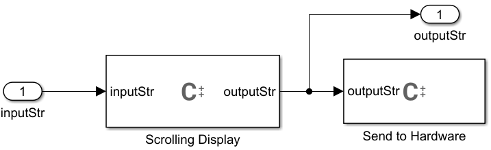 The C Function block named Send to Hardware propagates the fixed-size string outputStr to an external hardware display board. This block uses a hardware function call set_display that uses outputStr as an input argument to generate the code for the external hardware display board.
