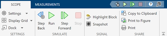 Introduced in R2015bThe Simulink Scope, Time Scope (DSP System Toolbox), and Floating Scope and Scope Viewer blocks in Simulink have a new user interface that you can use to access settings and measurements of the scope. The scope is now more responsive and its performance is improved. Use the new scope container to dock multiple scope windows into a single window and to manage and organize the scopes. The scope container also enables you to view all the scopes in the model in a single window.