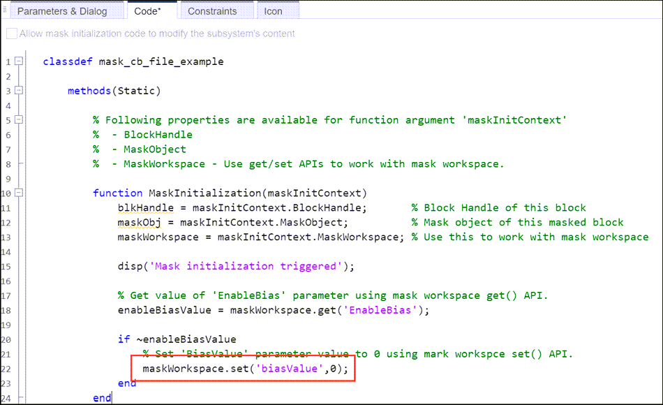 variables, parameters. Set the values of mask workspace variables and parameters using the