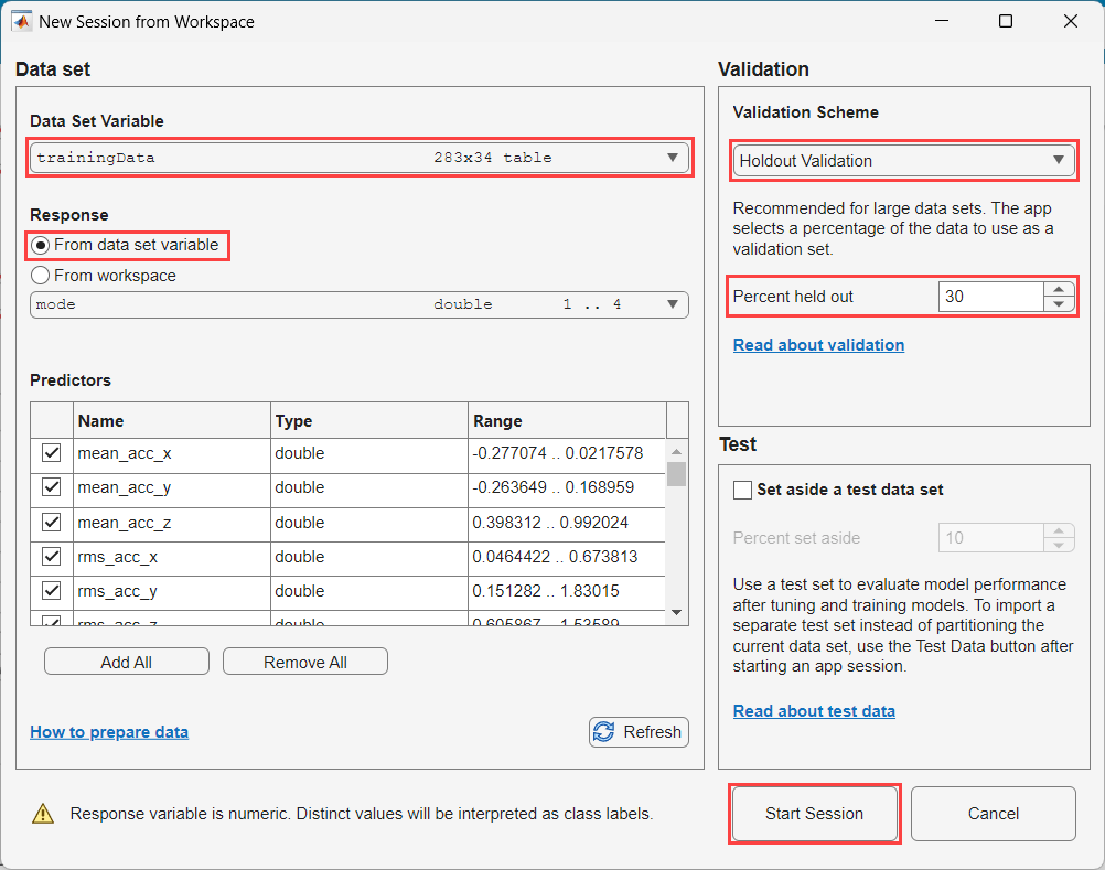 3. In the New Session from Workspace dialog box, select the extracted_features.mat